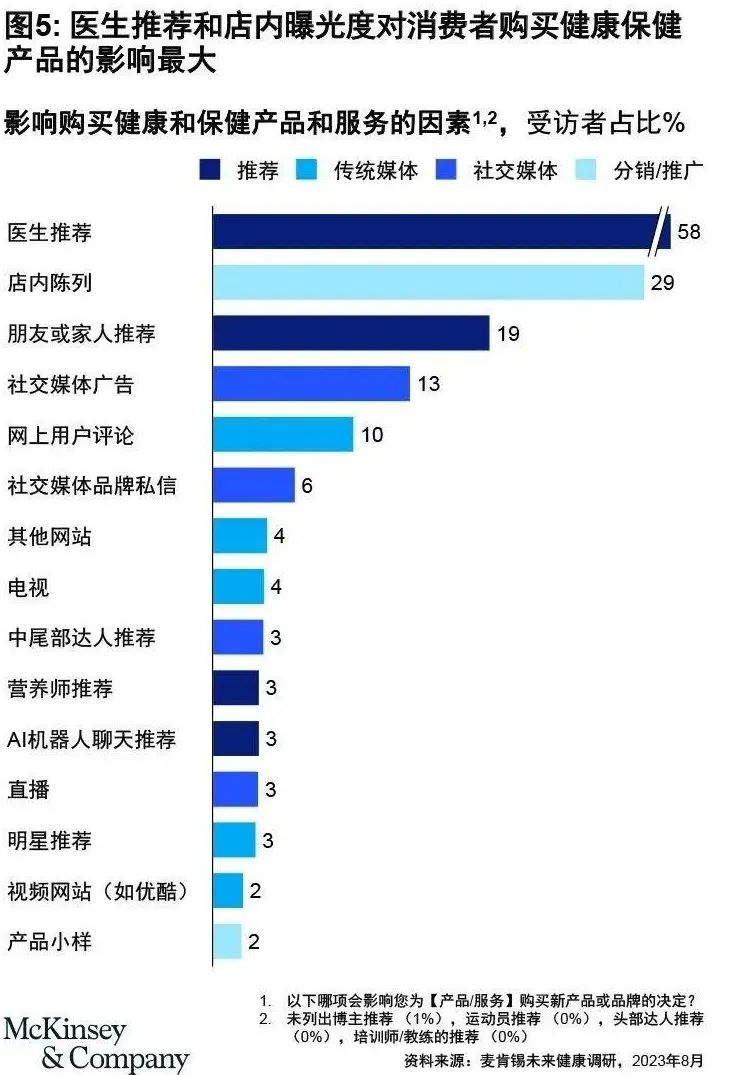 在美国医生推荐是影响消费健康和保健产品购买决策的第三大因素而在中国医生推荐则是消费者购买保健品最重要的决策影响因素。消费者表示,他们在寻求有关心理治愈、睡眠健康和整体健康调理时,医生的建议最具影响力。