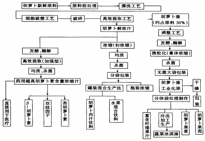 胡萝卜加工“高效阶段”是以胡萝卜浓缩汁为原料,提取β-胡萝卜素。目前,国际上所用的β一胡萝卜素绝大多数为化学合成的胡萝卜素片剂,而研究表明, 纯粹的化学制剂与富含该种物质的天然食物有本质的不同,天然食物具有的功 能,往往是其本身移种物质综合的结果,因此在服用类胡萝卜素片剂无助于防癌 的情况下,从天然胡萝卜汁中提取β一胡萝卜素具有巨大的市场潜力。此项工艺仍在进一步开发之中。