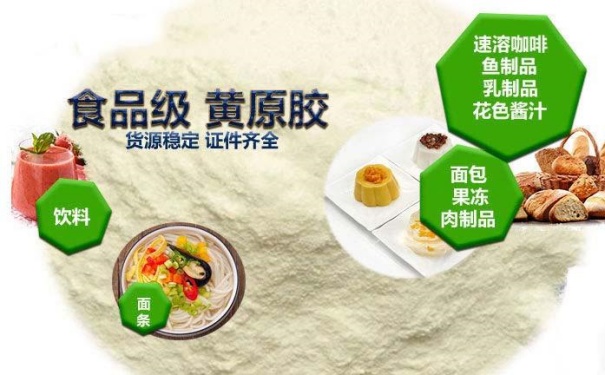 黄原胶是白色或浅黄色的粉末,具有优良的增稠性、悬浮性、乳化性和水溶性,并具有良好的热、酸碱稳定性,所以被广泛应用于各种食品中。