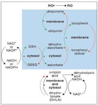 (2)在细胞浆的RO●自由基,直接由抗坏血酸淬灭,产生脱氢抗坏血酸,然后可由谷胱甘肽(GSH)再次转变成抗坏血酸。α-硫辛酸和DHLA均可以直接淬灭氧自由基。同时DHLA本身是一个强还原剂,可以还原氧化型维生素C、维生素E和氧化型谷胱甘肽(GSSG)。