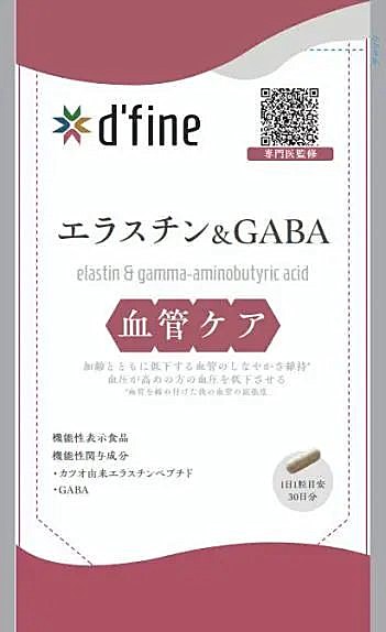 日本メドック株式会社推出的エラスチン&GABA(アンドギャバ)含有源自鲣鱼的弹性蛋白肽,有助于维持血管的柔软度(血管的扩张程度),这种柔软度会随着年龄的增长而降低。此外,GABA具有降低高血压患者血压的功能。