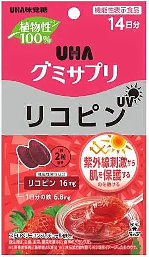 UHA 软糖补充剂含有番茄红素,具有抗氧化作用。研究表明,健康男性和女性连续摄入16 毫克番茄红素10~12周可显著提升皮肤对紫外线伤害的防护能力,同时有效减轻紫外线引起的红斑反应。