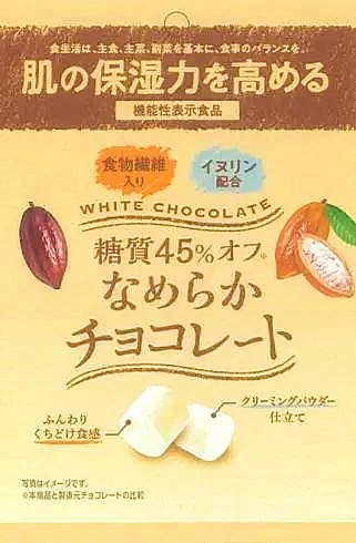 クリート株式会社推出的白巧克力,主要成分为菊粉。据报道,每天摄入含有4.5克菊粉的食物,与对照组相比,菊粉摄入组皮肤保湿能力(屏障功能)增加,经皮水分流失减少,皮肤弹性增强。