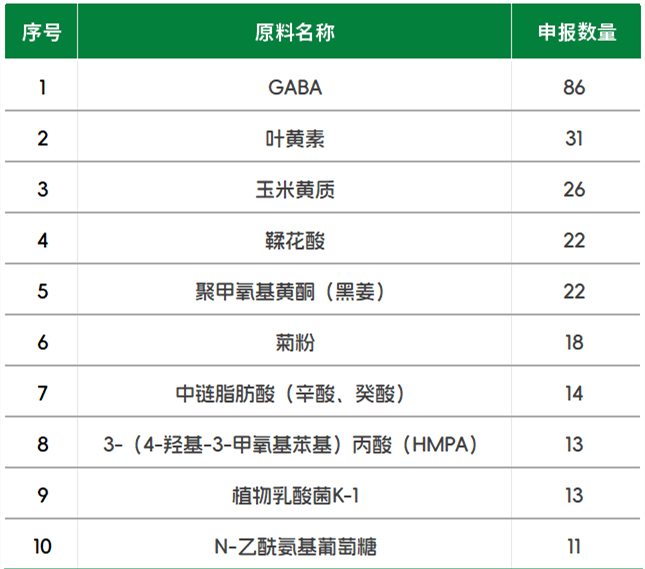 GABA依旧是日本上半年使用频次最多的原料(86件),与此同时,GABA成混搭常客,与其他健康原料相结合,实现护眼、降血糖、血管健康等多重健康功能。