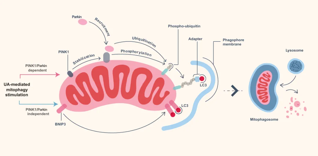 UA激活线粒体自噬的两个主要途径包括PINK1/Parkin依赖途径和PINK1/Parkin非依赖途径。在PINK1/Parkin依赖途径中,损伤线粒体上的PINK1蛋白积累并募集Parkin,后者促进线粒体蛋白的泛素化,这些泛素化蛋白被PINK1磷酸化,形成磷酸化泛素链,吸引自噬适配蛋白LC3,促进自噬泡的形成和线粒体的吞噬。而在PINK1/Parkin非依赖途径中,线粒体蛋白如BNIP3、NIX和FUNDC1直接与LC3相互作用,启动自噬泡的形成,同样能够清除损伤线粒体。