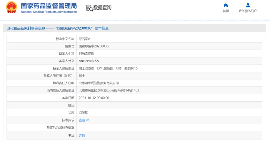 2023年10月,尿石素A在国内完成化妆品新原料备案(备案号为“国妆原备字20230036”),现处于监测期。其使用目的为抗皱剂,可用于喷雾类产品除外的护肤类化妆品。