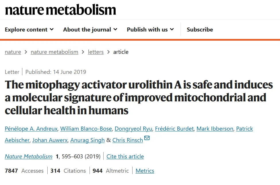 2016年,华盛顿大学研究人员在《Nature Medicine》发表的研究显示,尿石素A能促进线粒体自噬,将秀丽隐杆线虫的寿命延长45%,成为获科学界公认的首个具有促进线粒体自噬功能的天然化合物。2019年,尿石素A的首次人体临床试验显示了延缓衰老的作用,显著提升了全身脂肪酸氧化水平,这是线粒体功能的重要指标。