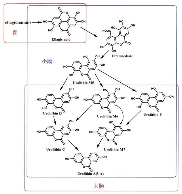 尿石素A(Urolithin A, UA)是天然多酚化合物鞣花单宁(ellagitannin, ET)类的肠道菌群代谢物,于2005年被Begoña Cerdá发现并正式命名。ETs作为UA的代谢前体,主要存在于石榴、草莓、核桃和覆盆子等天然食物和药物中。在体内,ETs在上消化道中转化为鞣花酸(EA),进一步脱去内酯环并脱羧生成尿石素M5(UM5),UM5在脱羟基酶的催化下脱去不同位置和个数的羟基产生一系列尿石素类物质,最终代谢产生UA,其化学结构可看作是苯骈香豆素类化合物,具有2个羟基取代的二苯骈吡喃-6-酮衍生物。