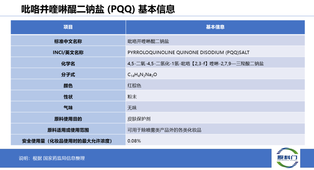 作为化妆品新成分,吡咯并喹啉醌(PQQ)已列入欧盟委员会Cosing化妆品物质和成分信息数据库,其功能为:抗氧化、保湿、皮肤调理、皮肤保护。
