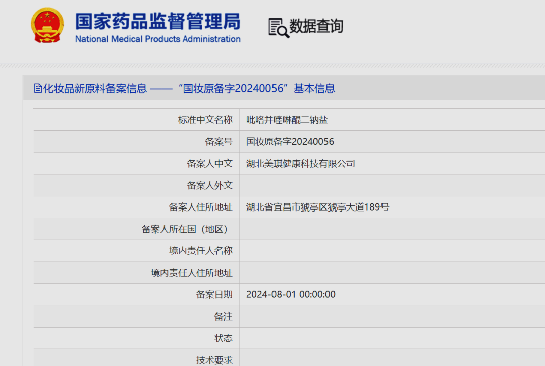 国家药品监督管理局化妆品原料备案信息平台显示,湖北美琪健康科技有限公司(以下简称:美琪健康)完成吡咯并喹啉醌二钠盐(PQQ)新原料备案,备案号为:国妆原备字20240056,目前处于监测期,这是继水羊生物之后PQQ化妆品原料备案成功的第二家企业。