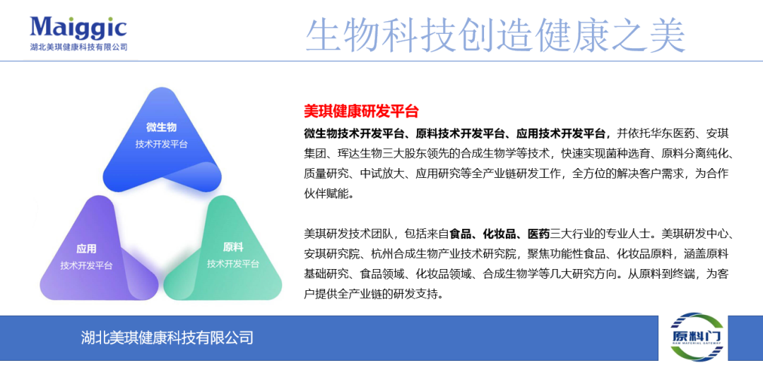 公开信息显示,备案人——湖北美琪健康科技有限公司,成立于 2021 年,位于湖北省宜昌市,由杭州中美华东制药有限公司、湖北安琪生物集团和浙江珲达生物科技有限公司共同合资建立。是一家集健康产业、医疗美容产品的研发、孵化、产业化和商业化为一体的大健康产业综合性公司。其深耕营养健康食品原料、个人护理功能原料业务领域、功能性皮肤护理领域,立志成为以技术创新为驱动的功能健康领域国际化领先企业。