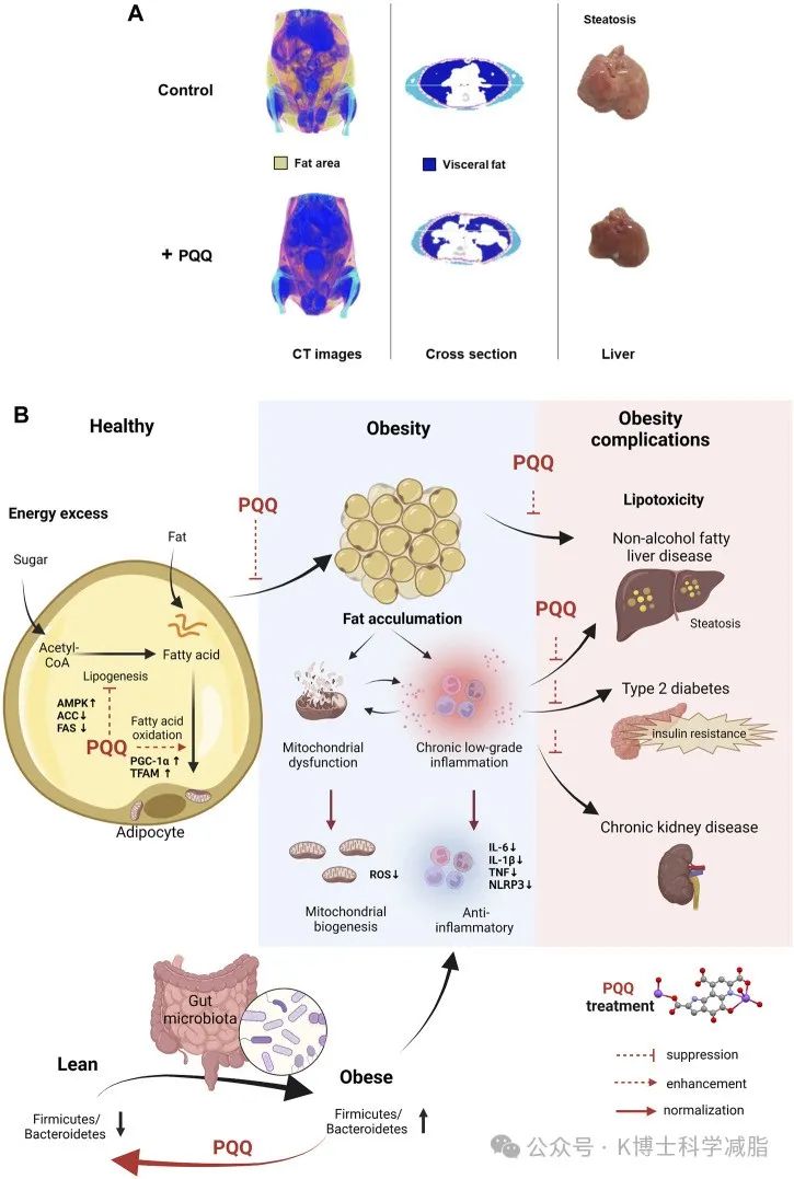 PQQ可以改善受损的线粒体(自噬)功能,还可以减少脂肪的堆积,改善代谢功能。