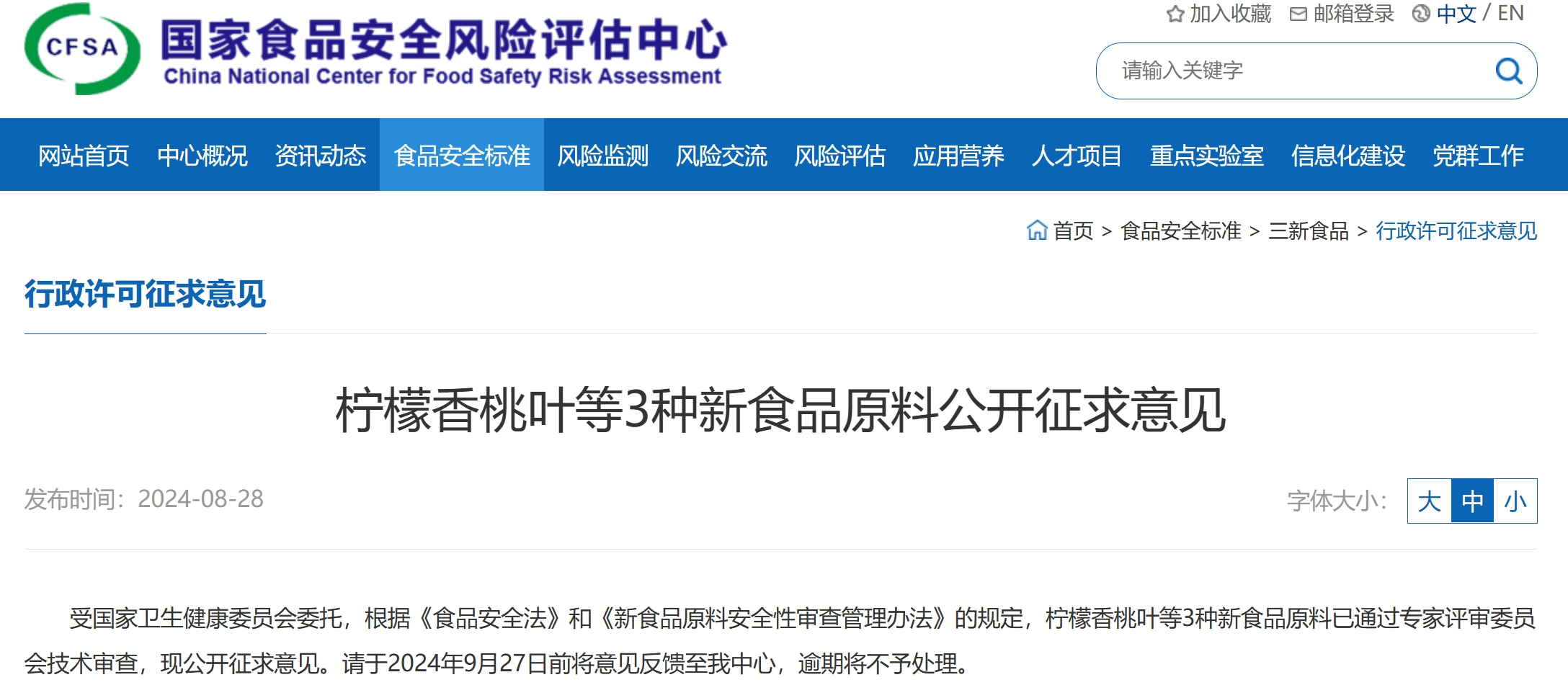8月28日,国家食品安全风险评估中心发布《柠檬香桃叶等3种新食品原料公开征求意见》,柠檬香桃叶、马基莓花色苷、小麦极性脂质3种新食品原料已通过专家评审委员的技术审查[1]。这意味着柠檬香桃叶等原料或将在未来正式成为新食品原料。同时,我国食品原料种类将进一步增加,人们对健康和营养的需求会得到更好地满足。