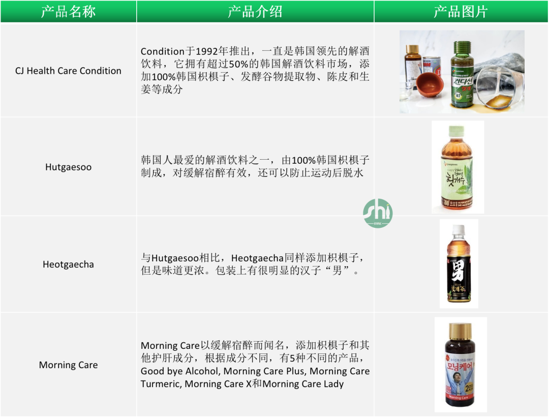 枳椇子在韩国被称为解酒“圣物”,韩国对枳椇子的开发可以作为我国枳椇子产品开发的方向标。2013年之前,韩国的解酒市场一直以饮料为主,韩国有4款非常热门的含枳椇子的解酒饮料,可以在便利店和药店轻松购买。