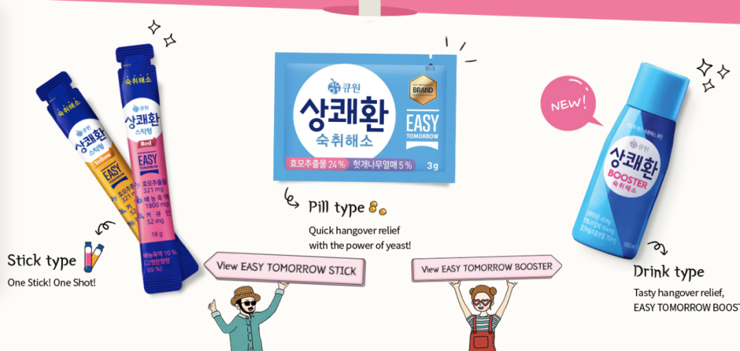 2013年之后,当韩国三养推出EASY TOMORROW之后,韩国解酒产品品类开始多样化。韩国三养推出的解酒产品“EASY TOMORROW”,主要成分为酵母提取物和枳椇子,以药丸形式呈现,每份3 g;2019年,推出新的形式“EASY TOMORROW STICK”,每份18 g,功效成分更丰富,除了酵母提取物和枳椇子外,还添加了葛根、白术、山楂、干陈皮和维生素C;2023年,又推出饮料形式“EASY TOMORROW BOOSTER”。EASY TOMORROW系列在韩国很受欢迎,截止2022年,累计售出1.5亿包。