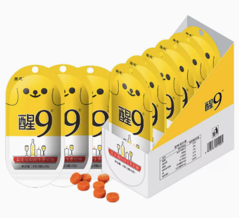 对标韩国的READY Q解酒糖,广慈食品开发一款解酒软糖“醒9”,添加葛根、枳椇子、枸杞、茯苓、玉米低聚肽和决明子。