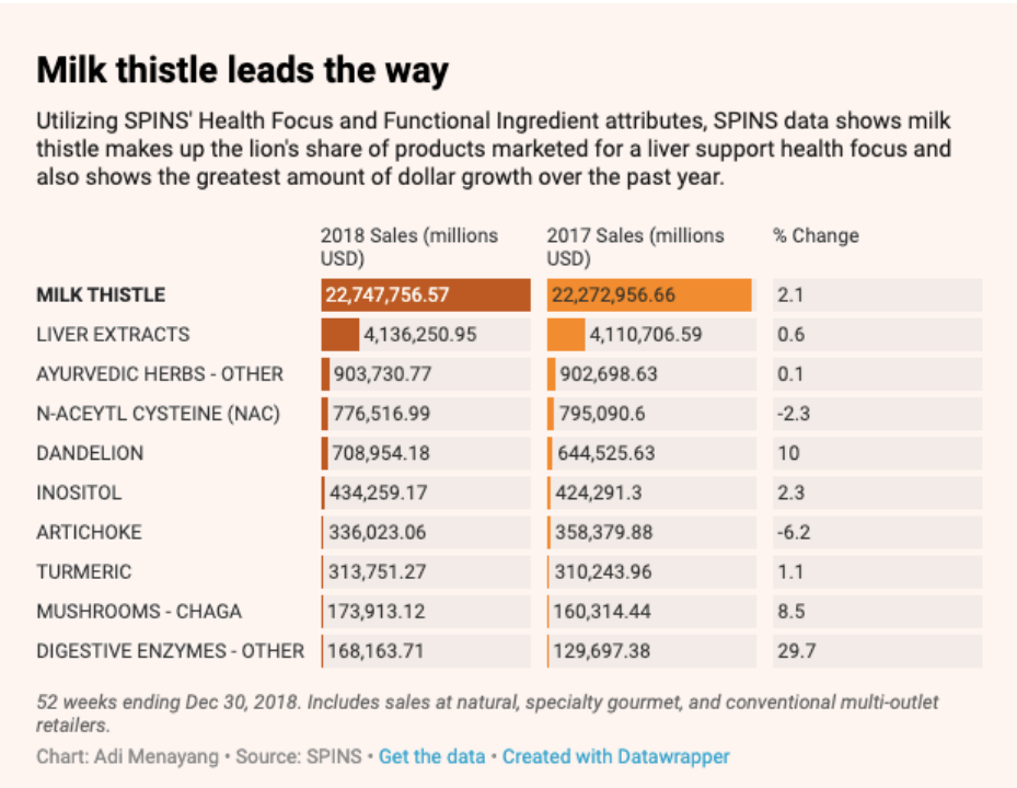 总部位于芝加哥的市场研究公司SPINS分析了2018年(截止至2018年12月30日之前的52周)美国天然食品、特色食品和传统多渠道零售商的销售额发现,在肝脏支持类别,销售额排名前10的原料分类是:奶蓟、肝脏提取物、阿育吠陀草药-其他、N-乙酰半胱氨酸 (NAC)、蒲公英、肌醇、朝鲜蓟、姜黄、蘑菇-白桦茸和消化酶-其他。其中奶蓟销售额大幅领先,达22,747,756.57百万美元,相比2017年,上涨2.1%。