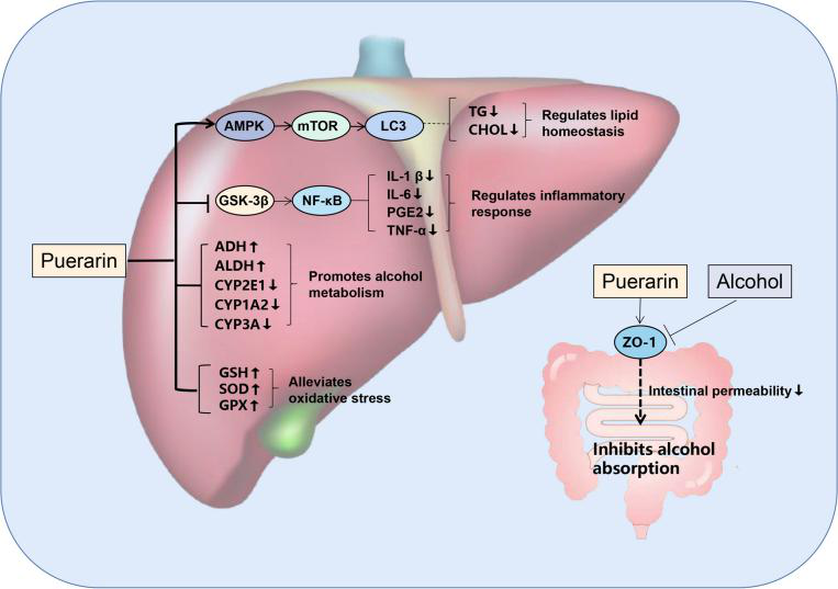 葛根素是1959年由日本科学家Yukio首次发现。研究表明,葛根素对长期饮酒引起的肝脏损伤具有保护作用,涉及多种机制。1)葛根素可以延缓胃排空,减慢酒精的吸收速度,降低肠壁通透性,保护胃肠道粘膜;2)葛根素通过激活乙醇代谢酶ADH和ALDH,同时选择性抑制细胞色素P450 2E1(CYP2E1),减少酒精代谢过程中的自由基产生,降低肝脏的氧化应激;3)葛根素还能通过激活AMP激活蛋白激酶(AMPK)和甾体激素受体(PPAR-γ)信号通路,调节肝脏脂质代谢,减少脂肪积累,对抗脂肪肝的发展。
