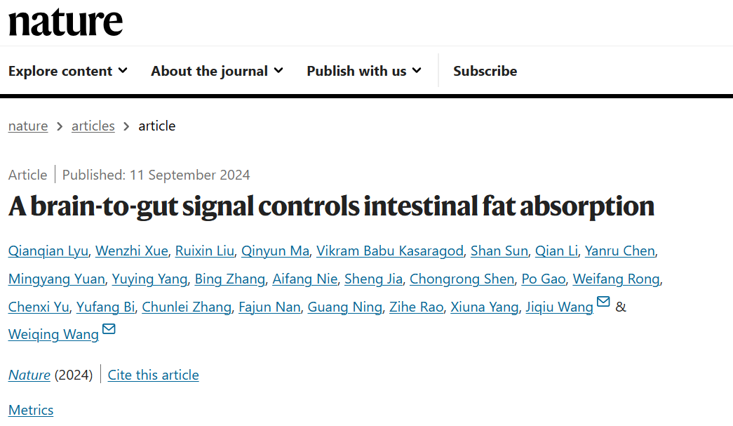 9月11日,上海交通大学医学院附属瑞金医院王卫庆、王计秋团队在顶级期刊《Nature》上发文,研究发现大脑能够通过“脑-肠轴”通道直接调控肠道的脂肪吸收,同时确定了葛根提取物—葛根素可结合GABRA1抑制该通道的DMV神经元,减少脂肪吸收,具有减脂潜力。