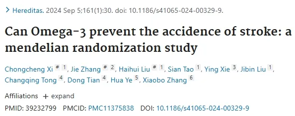 近期发表于《Hereditas》期刊的一项研究结果表明:Omega-3 可能通过降低血压间接降低缺血性中风的发生率。