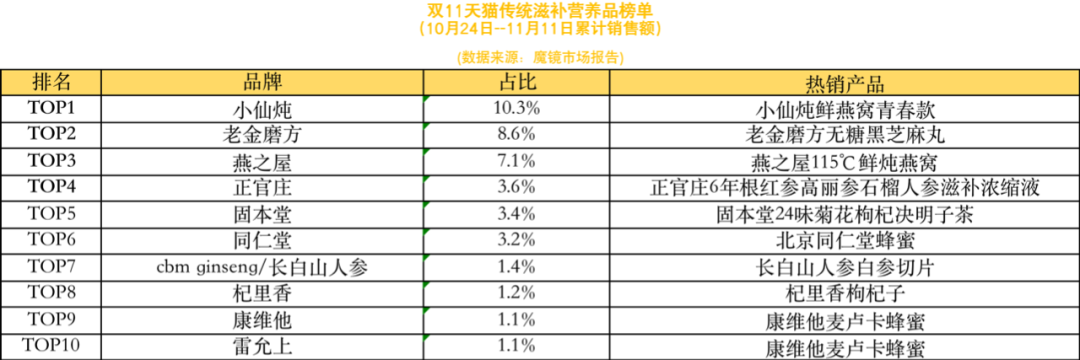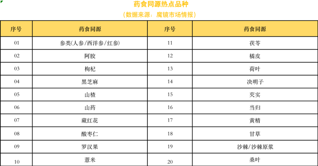滋补类目中燕窝、黑芝麻、人参、枸杞等品类仍大受欢迎。根据魔镜市场报告分析,淘宝天猫药食同源市场近一年规模超200亿元,市场规模同比增长22.3%。不论是初创公司,还是保健食品、药品及传统食品饮料企业,都将焦点关注在了药食同源,资本市场和媒体亦给予了药食同源产品极大关注。