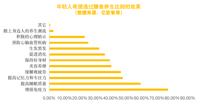 据欧睿数据预测2022年我国功能性食品市场规模将突破6000亿元,而据《Z世代营养消费趋势报告》显示,年轻人成为当下养生消费的主力军,其中18-35岁的年轻消费人群占比高达83.7%,药食同源+滋补类成为新生代消费首选。年轻人希望通过膳食养生进行健康的改善。其中,增强免疫力、提高睡眠质量、提高记忆力和专注力是年轻人的前三大诉求。