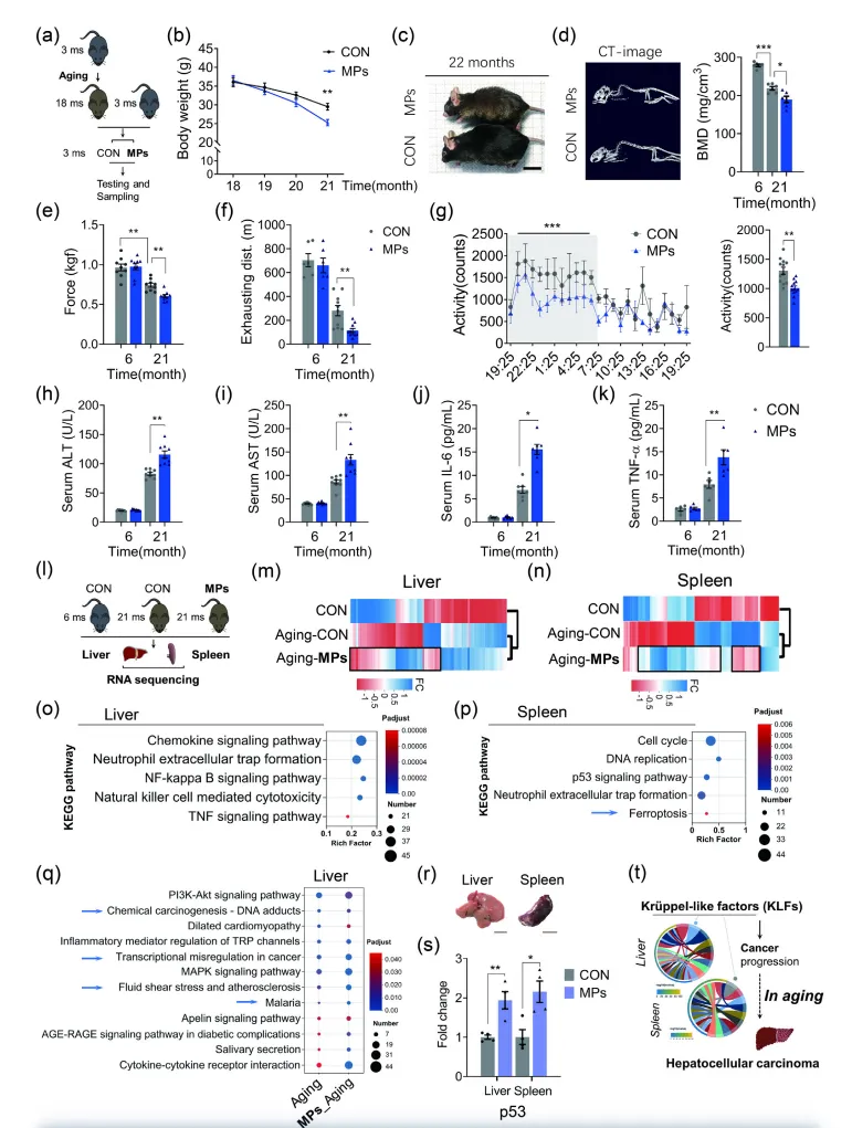 实验发现,老年小鼠暴露于微塑料后表现出体重下降、体毛颜色变化、脊柱弯曲度增加和骨矿密度降低等显著变化,运动能力下降,表明微塑料对老年个体的影响显著,而年轻小鼠受影响较小。