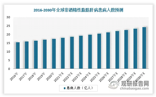 观研天下整理的数据还显示,全球非酒精性脂肪肝炎病患者数量从2016年的15.5亿人增长至17.6亿人,年复合增长率为3.1%,预计到2030年将达到24.3亿。
