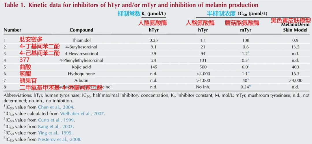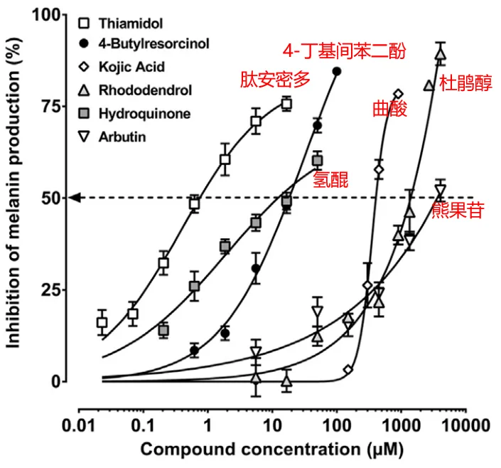 在黑色素皮肤模型中(上图、表1最右列),肽安密多抑制黑色素生成效果最强(IC₅₀=0.9 μmol/L),其次是4-丁基间苯二酚(IC₅₀=13.5 μmol/L)、对苯二酚(氢醌)(IC₅₀=16.3 μmol/L)、曲酸(IC₅₀= 400 μmol/L),熊果苷抑制效果可忽略(IC₅₀>4,000 μmol/L)。