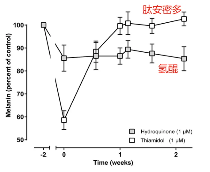 所示,长期黑素细胞单层培养实验显示,1 μmol/L肽安密多处理2周后黑素细胞黑色素生成减少到低于60%,去除肽安密多后1周内恢复;1 μmol/L对苯二酚(氢醌)处理后黑色素生成仅减少到约85%,且2周培养期内细胞未完全恢复黑色素生产能力。