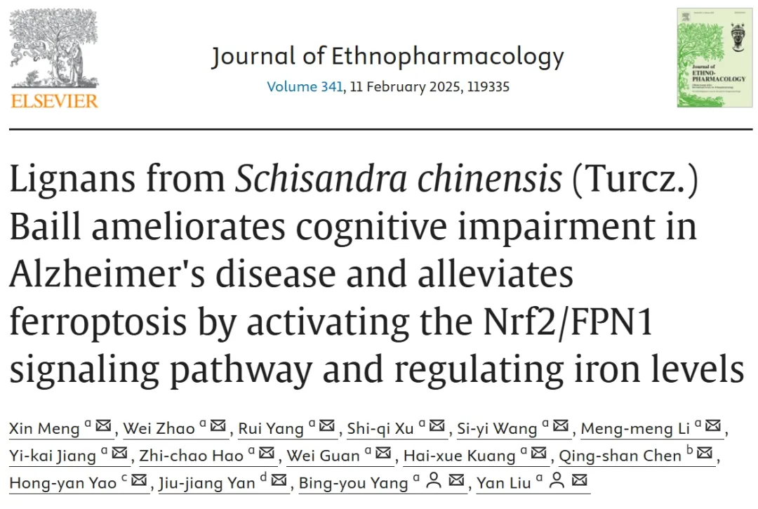 近期,Xin Meng等人在《Journal of Ethnopharmacology》上在线发表了一项研究成果。该研究发现,五味子中的木脂素可通过激活 Nrf2/FPN1 信号通路和调节铁水平来改善阿尔茨海默病的认知障碍并缓解铁死亡。