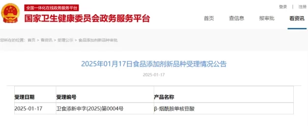 2025 年 1 月 17 日,国家卫生健康委员会于其政务服务平台发布了最新的食品添加剂新品种受理公告。公告显示,NMN(β- 烟酰胺单核苷酸)成功列入受理名单。这一举动意义重大,若 β- 烟酰胺单核苷酸的申报流程最终顺利获批,该成分将被正式批准作为食品添加剂,广泛应用于食品生产领域。
