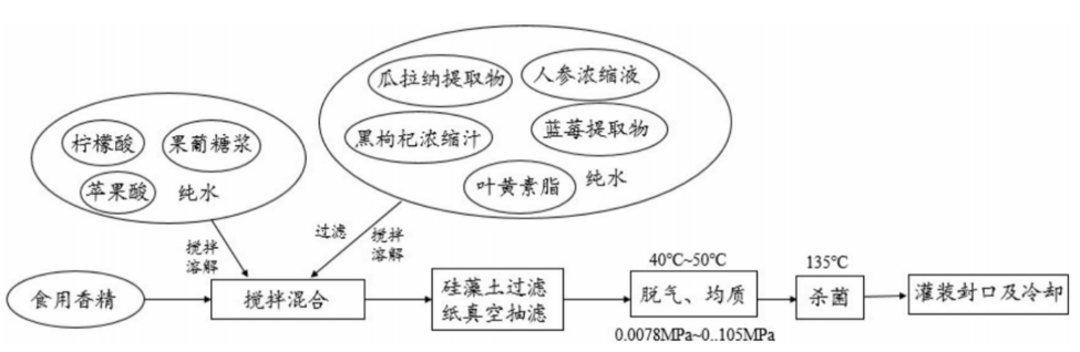 该饮料的原料组成主要为瓜拉纳提取物0.2%~1.0%,人参浓缩液1.5%~3.0%,黑枸杞浓缩汁5.0%~8.0%,蓝莓提取物0.15%~0.70%,叶黄素脂0.05%~0.45%,果葡糖浆7.0%~10.0%,柠檬酸0.17%~0.25%,苹果酸0.0065%~0.0450%,食用香精0.08%~0.65%。按照配方用量准确称量瓜拉纳提取物、人参浓缩液、黑枸杞浓缩汁、蓝莓提取物和叶黄素脂,然后用部分水搅拌溶解过滤,滤液中加入食用香精,然后加入水补足至100%,搅拌均匀。将调配好的饮料用硅藻土过滤纸真空抽滤。然后在温度40℃~50℃、真空度0.0078MPa~0.0105MPa下脱气,去除空气对饮料的影响。接着将调配好的饮料在60±5℃、压力18MPa~20MPa下用均质机进行均质。料液用超高温瞬时灭菌机加热至135℃,时间为3s~5s。最后将料液冷却至90℃,进行灌装封口、冷却,即得黑枸杞抗疲劳饮料。