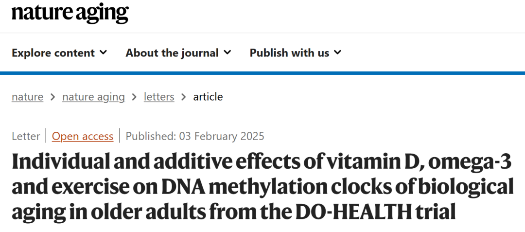 2025年2月,瑞士的研究团队在Aging上发表了一篇研究性文章,该文章指出老年人同时服用Omega-3、维生素D和力量训练的组合可以减缓表观遗传时钟的生物衰老速度。这项临床试验涉及777名老年人,在3年的试验期内,这些参与者每天摄入2000国际单位(IU)的维生素D,每天服用一克Omega-3,并且每周参加三次30分钟的家庭锻炼计划(单独或组合参加)。