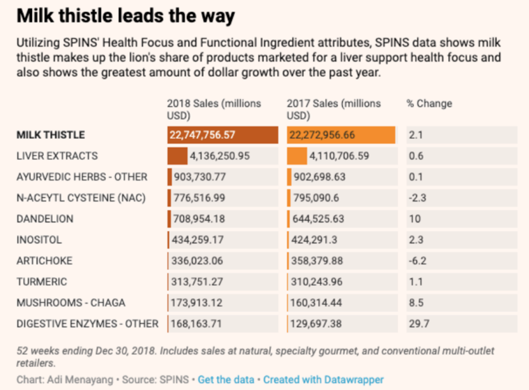 奶蓟草类产品是当前护肝市场当之无愧的“领头羊”:国内京东平台 “养肝清肺营养保健榜”当中,TOP10产品中有五款以奶蓟草为主要成分;在国外市场表现更为优秀,美国肝脏支持类别天然食品、特色食品等中,奶蓟草类产品销售额长期大幅领先。