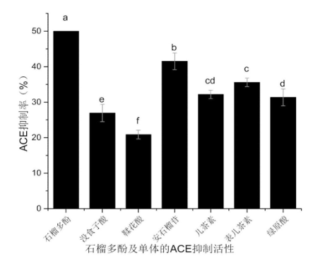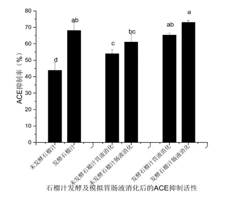 对比石榴汁发酵前后胃肠道ACE抑制活性发现,从石榴汁中分离出的酚类化合物已被证明是体外有效的ACE抑制剂。但对自发性高血压大鼠(SHR)进行的不同实验证实酚类化合物(例如槲皮素,阿魏酸和单宁酸)在体内具有降血压的作用。经过模拟胃肠液发现石榴汁发酵24h后ACE抑制活性由发酵前的43.86%提高到68.05%,提高了24.19%。模拟胃液消化后石榴汁ACE活性由发酵前的53.98提高到65.34%,提高了11.36%,肠液消化后ACE活性由发酵前的61.08%提高到73.01%,提高了11.93%。