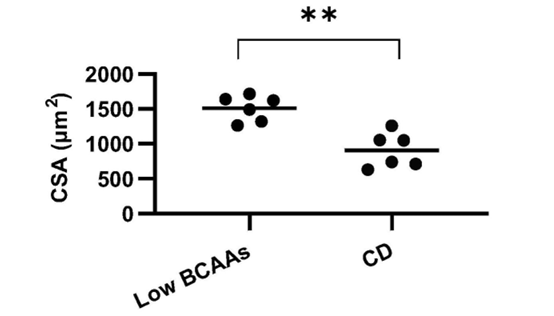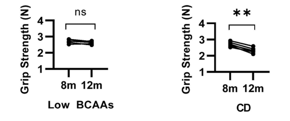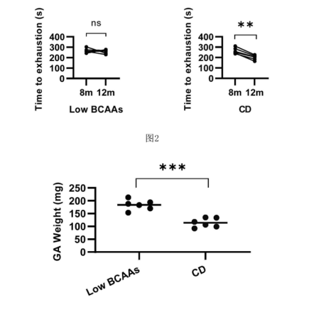 通过小鼠握力实验、力竭运动实验、小鼠肌肉含量以及肌纤维含量分析比较上述制备的低BCAAs减重增肌营养粉剂与芊动蛋白奶昔的增肌效果。结果表明低BCAAs减重增肌营养粉剂小鼠中第一个组的小鼠8个月时的握力为2.5~3N,4个月后,小鼠的握力为2.5~ 3N,无明显下降;而第2组小8个月时的握力在2.5~3N,4个月后,小鼠的握力下降到了2~ 2.5N。试验结果表明,本产品有利于保护生物体的肌力。