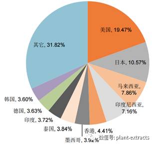 分区域看,我国植物提取物出口市场较为分散,包括了100多个国家和地区,主要的市场有美 国、日本、欧洲和东南亚,其中美国和日本是第一、第二大市场,分别约占我国植物提取物出口份 额的19.5%和10.6%。不同的出口市场对产品需求也存在较大差异,美国对我国植物提取物需求来自 膳食补充剂和食品添加剂,出口日本市场产品主要用于保健品和汉方药生产,对东南亚出口主要为 天然色素、香精香料;对德国的出口主要是芦丁等药用植物成分。 分产品看,我国出口植物提取物种类众多,单一品种的占比较低,最大的出口产品甜菊提取物占比 也仅约7%。根据2014年市场分析,出口排名前十大的植物提取物为甜菊、桉叶油、甘草、辣椒、越 橘、桂油、万寿菊、肌醇、芸香苷及其衍生物、罗汉果提取物。