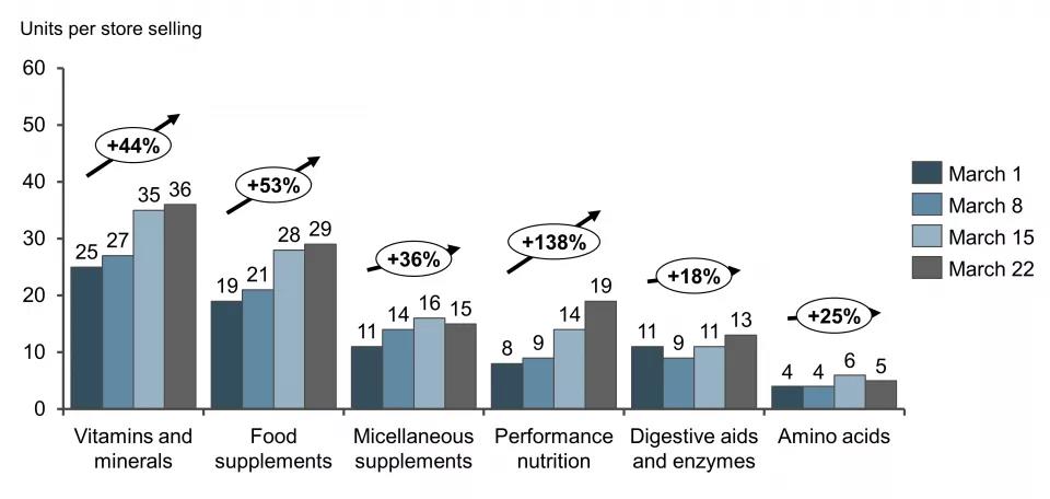 但是对于食品补充剂行业来说,受疫情影响却呈现逆势增长。以美国为例,疫情初期,在Twitter、Reddit等主流媒体网站上,提高免疫力的产品访问量增加了4.4倍,抗炎产品的访问量增加了2.8倍,对应的接骨木莓产品访问量增加了16.6倍,紫锥菊增加了9.4倍、维生素C、D都增加了三倍以上。在这种访问量下,美国3月份维矿类、氨基酸、消化酶、食品补充剂等产品销量都有大幅度的增长。