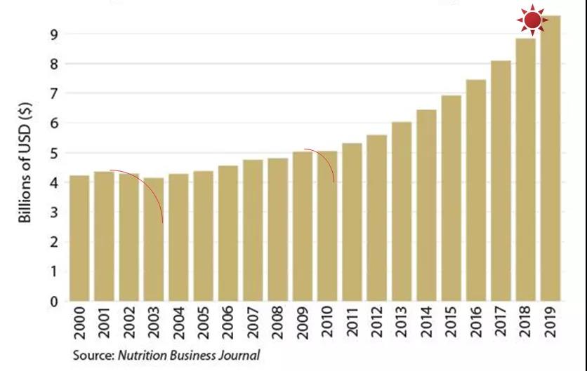 尽管亚太地区增长很快,但作为全球植提市场风向标的美国市场体量依然很大。根据NBJ数据,2019年草本膳食补充剂在美国总销售额达到96.02亿美元,比2018年多花费了7.5亿美元,比2018年增长8.6%。从2000年以来,美国市场只有在2003年、2010年出现过负增长,总体趋势是增长的,增长幅度5%左右,预计2020年的增长率将超过10%。