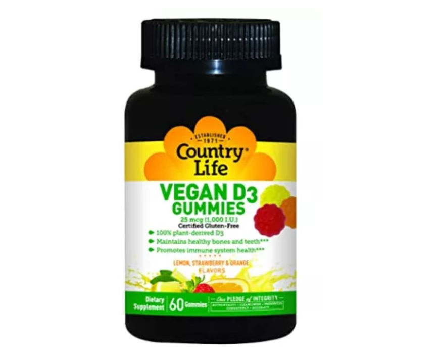 Country Life 100%素食维生素D3补充剂,来自地衣藻,每份包含1,000 IU维生素D3。