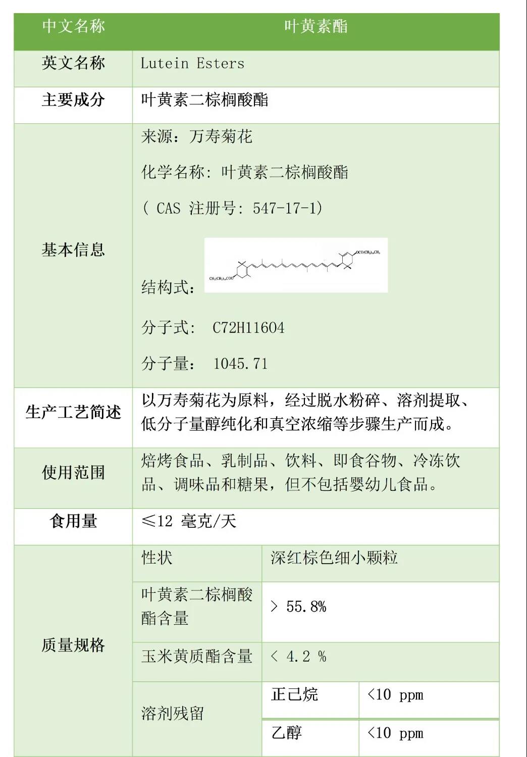 而且2008年卫生部第12号文件批准叶黄素酯(化学名称: 叶黄素二棕榈酸酯)为新食品原料,其初始来源就是万寿菊花,工艺说明是以万寿菊花为原料,经过脱水粉碎、溶剂提取、低分子量醇纯化和真空浓缩等步骤生产而成。规定每天的使用量≤12 毫克/天;使用范围包括焙烤食品、乳制品、饮料、即食谷物、冷冻饮品、调味品和糖果,但不包括婴幼儿食品。