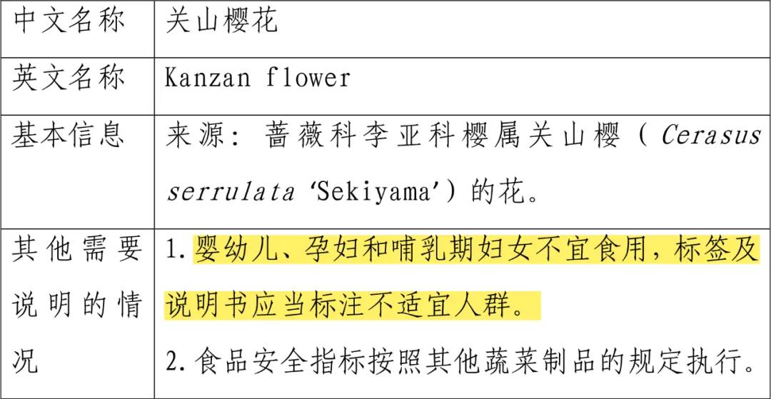 新食品原料生产和使用应当符合公告内容以及食品安全相关法规要求。鉴于关山樱花在婴幼儿、孕妇及哺乳期妇女人群中的食用安全性资料不足,从风险预防原则考虑,上述人群不宜食用,标签及说明书中应当标注不适宜人群。