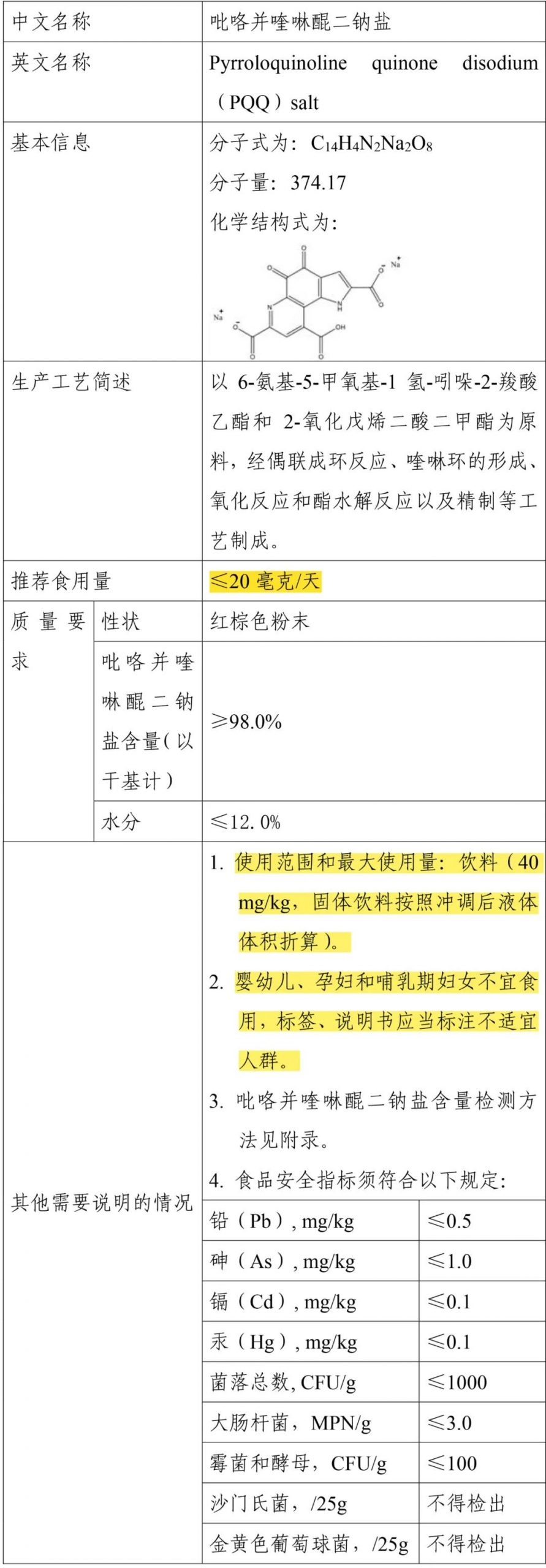 吡咯并喹啉醌二钠盐是以6-氨基-5-甲氧基-1氢-吲哚-2-羧酸乙酯和 2-氧代戊烯二酸二甲酯为原料,经偶联成环反应、喹啉环的形成、氧化反应、酯水解以及精制等工艺制成。吡咯并喹啉醌二钠盐天然存在于多种食物如牛奶、鸡蛋、菠菜等中。本申报产品的纯度为≥98%。吡咯并喹啉醌二钠盐已获得美国 GRAS 认证,可作为原料用于能量饮料、运动饮料、电解质饮料以及瓶装水等食品;欧盟和加拿大作为膳食补充剂或天然保健食品;日本在食品药品分类中划分为非药物类。本产品推荐食用量为≤20毫克/天(即含量为 98%的吡咯并喹啉醌二钠盐推荐食用量为 20 毫克/天,超过该含量的按照实际含量折算)。使用范围和最大使用量:饮料(40 mg/kg,固体饮料按照冲调后液体体积折算)。
