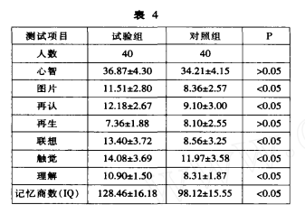 选择符合条件的测试者 80名,随机分成试验组和对照组。采用双盲法进行 处理,实验组服用样品“神经酸”,对照组服用安慰剂,除有效成份外,剂型、口感、实验外观和包装与样 品完成相同,以消除心理暗示作用。每日给样 0.125g/60KG,连续服用1个月。测试心智、图片、再认、再生、联想、触觉、理解等项内容,计算记忆商数 (IQ),经过数处理排除其他因素尤其是迁移学习和 心理暗示作用的影响。见表4。
