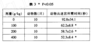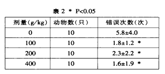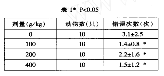 各剂量组与对照组小白鼠连续给样四周,末次给样后次日开始训练,将小白鼠放入反应箱内适应 3分钟,然后立即通以36V的交流电,小白鼠受到电击,其正常反应是跳回平台,以躲避伤害性刺激,多数小白鼠可能再次或多次跳至铜栅上,受到电击又迅速跳回平台。如此训练5-8分钟,记录5分钟内错误次数,以此作为学习成绩,24小时或48小时 后重作试验,记录受电击动物3分钟内的错误总数, 同时计算动物出现错误反应的频率。记录数据见表 1。