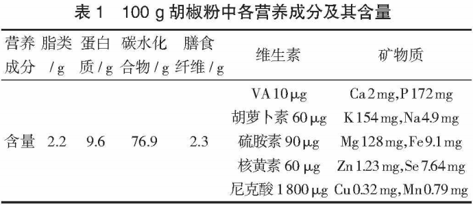 从 《中国食物成分表》 中可以看出胡椒含有丰富的营养成分(见表1) 和多种生物活性成分,包括生物碱、挥发油、有机酸、香豆素、酚类化合物、类黄酮 、皂角苷、甾醇等,其中挥发油、生物碱和有机酸又包含多种物质。100g胡椒粉中各营养成分及其含量见表1。